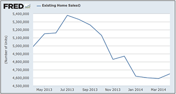 The housing “recovery” that so many economists touted last year has not only stalled, but reversed course. It's a drag on the economy, a liability. Applications for mortgages to buy homes are down 21% from this time last year. Residential fixed investment (which includes construction, home repairs, and broker commissions) fell 5.7% in the first three months of the year. That's the second straight quarter of declines, after a 7.9% drop in the fourth quarter of 2013. To put that in perspective, residential investment accounted for 3.1% of GDP in the fourth quarter, less than half the peak contribution of 6.6% in 2006.