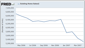 Everything we've suspected about the US market is coming to fruition: housing is crashing (again), unemployment and stagnant wages have crimped spending, the US Federal Reserve is fumbling as it tries to rein in its stimulus, and all indications are that the US is already slipping into another recession. Starting with the housing market, there are signs of some eerie parallels with 2007. Here's a look at existing home sales over the past year...